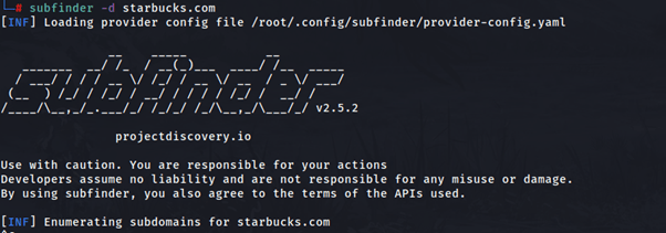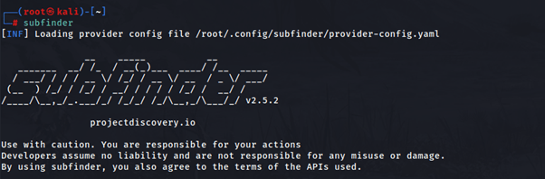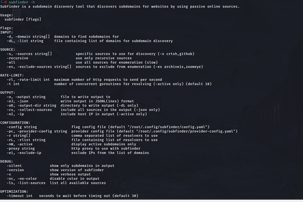 Step 3: Now there are various flags that are available in subfinder. So, you will have to enter subfinder -h command to see other flags